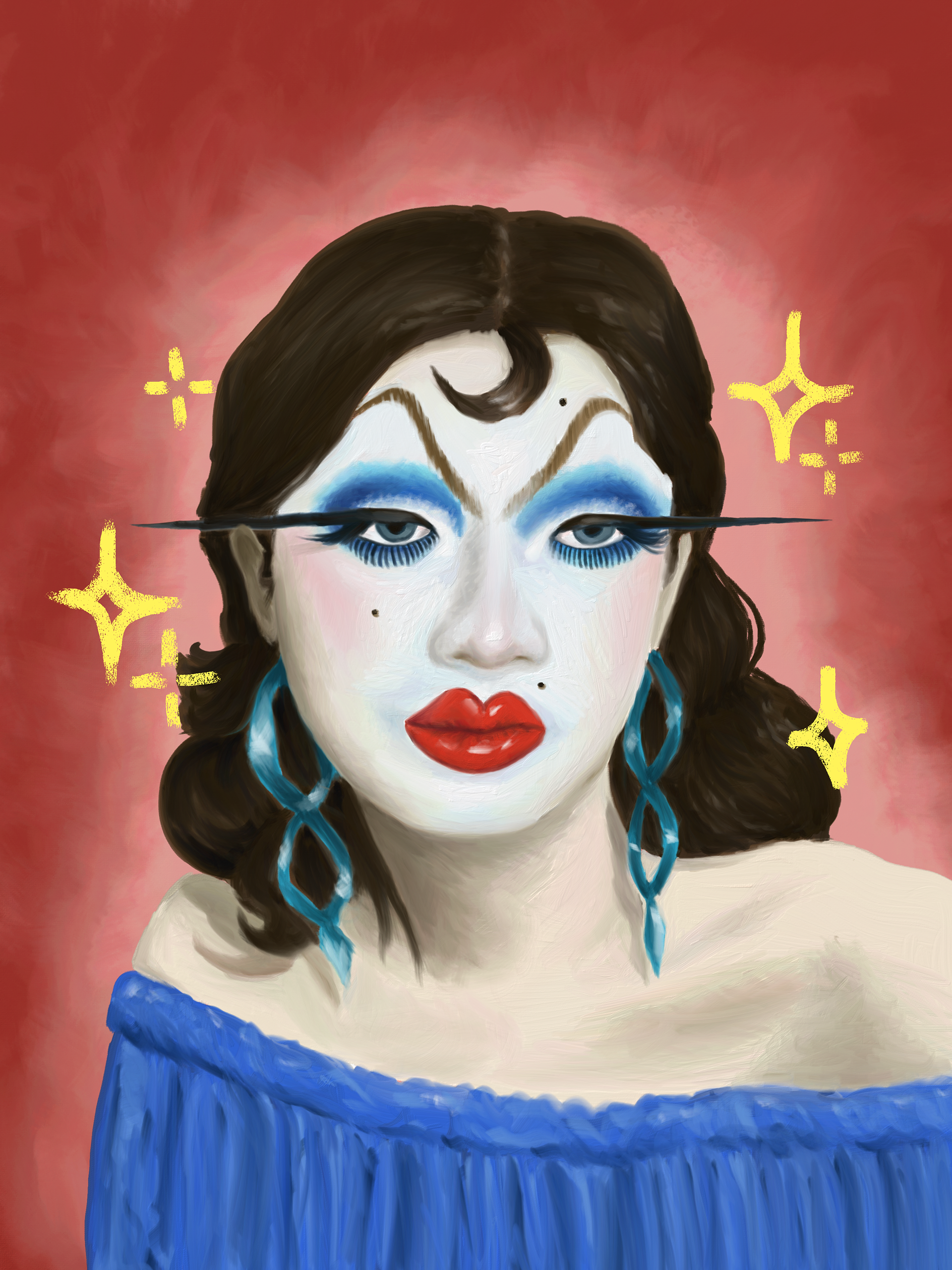 Digital oil painting of a drag look made in Adobe Fresco. Had a fun time learning to use this program! It’s super versatile. Can’t wait to make more with it!